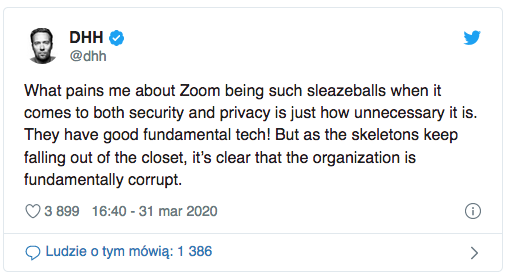 Jakie padają zarzuty wobec Zooma? Przede wszystkim udowodniono, że rozmowy na Zoomie nie są objęte szyfrowaniem kontrolowanym przez klienta (end-to-end) – mimo, że firma twierdzi, że są. Co więcej, aplikacja instaluje również ukryty serwer sieciowy na komputerach Mac, który pozostaje w użyciu nawet po odinstalowaniu programu. Dzięki niemu dowolny hacker mógłby włączyć kamerę użytkownika zdalnie, bez jego wiedzy ani pozwolenia. Tutaj musiało zainterweniować samo Apple po tym, jak jeden z badaczy zabezpieczeń wykrył taką lukę.