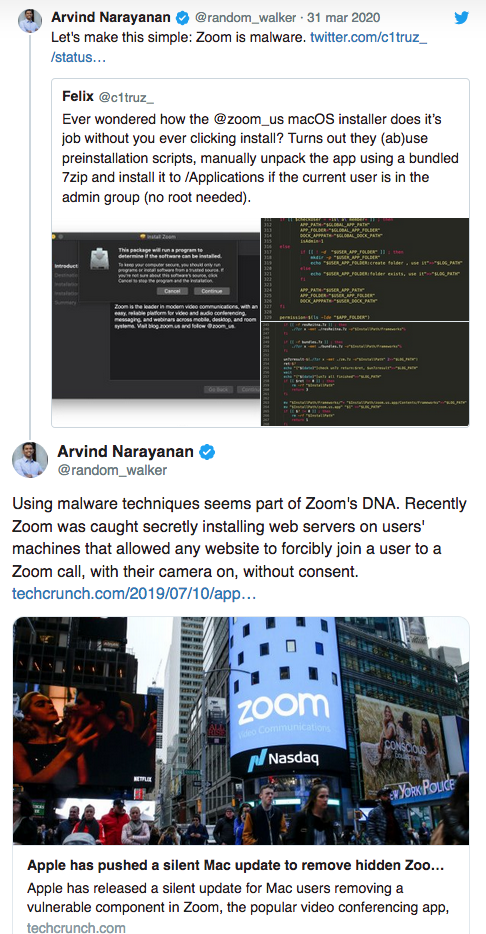 Lista oskarżeń jest bardzo, bardzo długa, a profesor Arvind Narayan z Uniwersytetu Princeton nie zamierzał przebierać w słowach i powiedział, że "Zoom to malware". Dodał również, że używanie technik typowych dla złośliwego oprogramowania leży w DNA firmy.