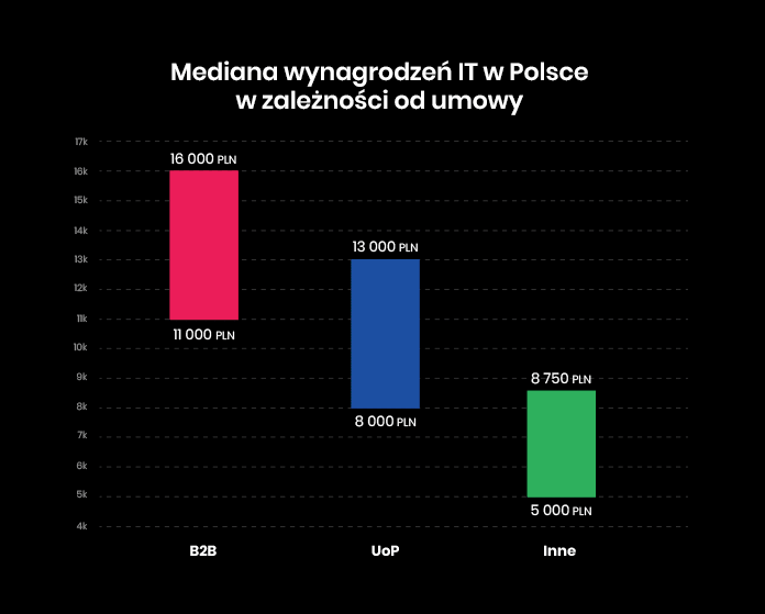 Pracodawcy najchętniej zatrudniają programistów na umowach B2B – taka forma współpracy w 2019 r. proponowana była aż w 60 proc. ogłoszeń. Także wzrost mediany wynagrodzeń był tu wyższy niż w przypadku umowy o pracę i wyniósł 10 proc. Mediana najniższych wynagrodzeń w B2B wyniosła 11 000 zł, a najwyższych 16 000 zł na fakturę. Na umowie o pracę było to odpowiednio 8 000 zł i 13 000 zł brutto. Jeszcze mniej mogli zarobić pracownicy interesujący się innymi formami umów.