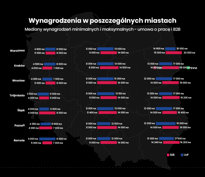 W 2019 r. największe ośrodki IT były także najlepszymi lokalizacjami do pracy – tak wynika z raportu No Fluff Jobs. W Warszawie można było zarobić średnio 14 530 zł na B2B lub 12 000 zł brutto na umowie o pracę. Podobnie było w Krakowie, który zajął drugie miejsce – programiści mogli tu odpowiednio zarobić 14 500 zł na B2B i 12 000 zł brutto na etacie. Ale i tu dały o sobie znać trendy wymienione wyżej – midzi i seniorzy zarabiają więcej w dużych miastach. Junior w Warszawie otrzymał w 2019 r. aż o 67 proc. niższe wynagrodzenie niż senior.