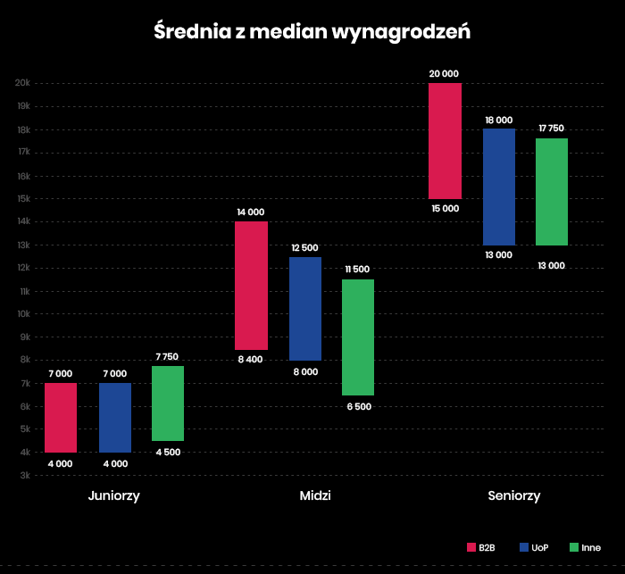 Wśród najmłodszych stażem programistów dominującą formą zatrudnienia według raportu No Fluff Jobs była umowa o pracę, którą oferowało w 2019 r. prawie 44 proc. pracodawców. Mediana wynagrodzeń oferowanych juniorom wyniosła od 4 000 do 7 000 zł (na B2B oraz UoP). Umowa cywilnoprawna była proponowana 5 razy częściej juniorom niż midom i seniorom. Wśród topowych technologii w tej grupie wiekowej dominowały JavaScript, Java oraz React.