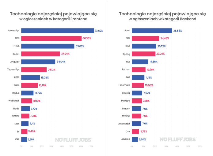 – Warto pamiętać, że sama znajomość technologii wiodącej już na rynku nie wystarczy. Pracodawcy dużo bardziej cenią sobie specjalistów, którzy np. w przypadku backendu, oprócz Javy znają SQL-a czy Springa i nie są zamknięci na zmiany. Takie wymagania coraz częściej pojawiają się jako niezbędne minimum do wykonywania pracy i ta tendencja będzie jeszcze postępować – tłumaczy Marek Psiuk, CTO w No Fluff Jobs.