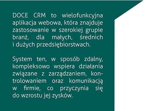 DOCE CRM to narzędzie, które znajdzie swoje zastosowanie w szerokim gronie branż w małych, średnich i dużych przedsiębiorstwach. System ten, w sposób zdalny, nie tylko wspiera kompleksowo zarządzanie zaplanowanymi wydarzeniami, ale również pozwala osiągać coraz lepsze wyniki sprzedażowe. Jest to możliwe m.in., dzięki bieżącemu dostępowi do danych o klientach, a także historii współpracy, dedykowanych ofertach, zamówieniach oraz należnościach.