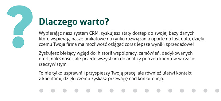 Ta multi-funkcyjna aplikacja webowa, to innowacyjne wsparcie dla managerów sprzedaży, marketingu, specjalistów ds. sprzedaży, handlowców oraz ich partnerów. Gwarantuje kompleksową komunikację, raportowanie oraz automatyzację procesów sprzedażowych (zamówienia, planowana sprzedaż, obsługa posprzedażowa). Przeglądarka internetowa to jedyny wymóg, jaki musi spełniać klient, aby mieć pełen dostęp do CRM-u, na każdym urządzeniu z dostępem do Internetu, w dowolnym miejscu i czasie. Aplikacja posiada rozbudowany moduł raportowania, dzięki czemu umożliwia ona prostsze egzekwowanie działań promocyjnych oraz gromadzenie danych rynkowych o bieżących trendach i działaniach konkurencji. System CRM posiada zbiór narzędzi i procedur, które są niezbędnym elementem, aby należycie budować relacje z klientami. Jego wdrożenie pozwala: zoptymalizować organizację pod względem czasu pracy, zapewnić bieżący wgląd w terminy wykonywanych zadań i/lub bazę klientów, a co za tym idzie: pomaga firmie rozwijać się w sposób płynny.
